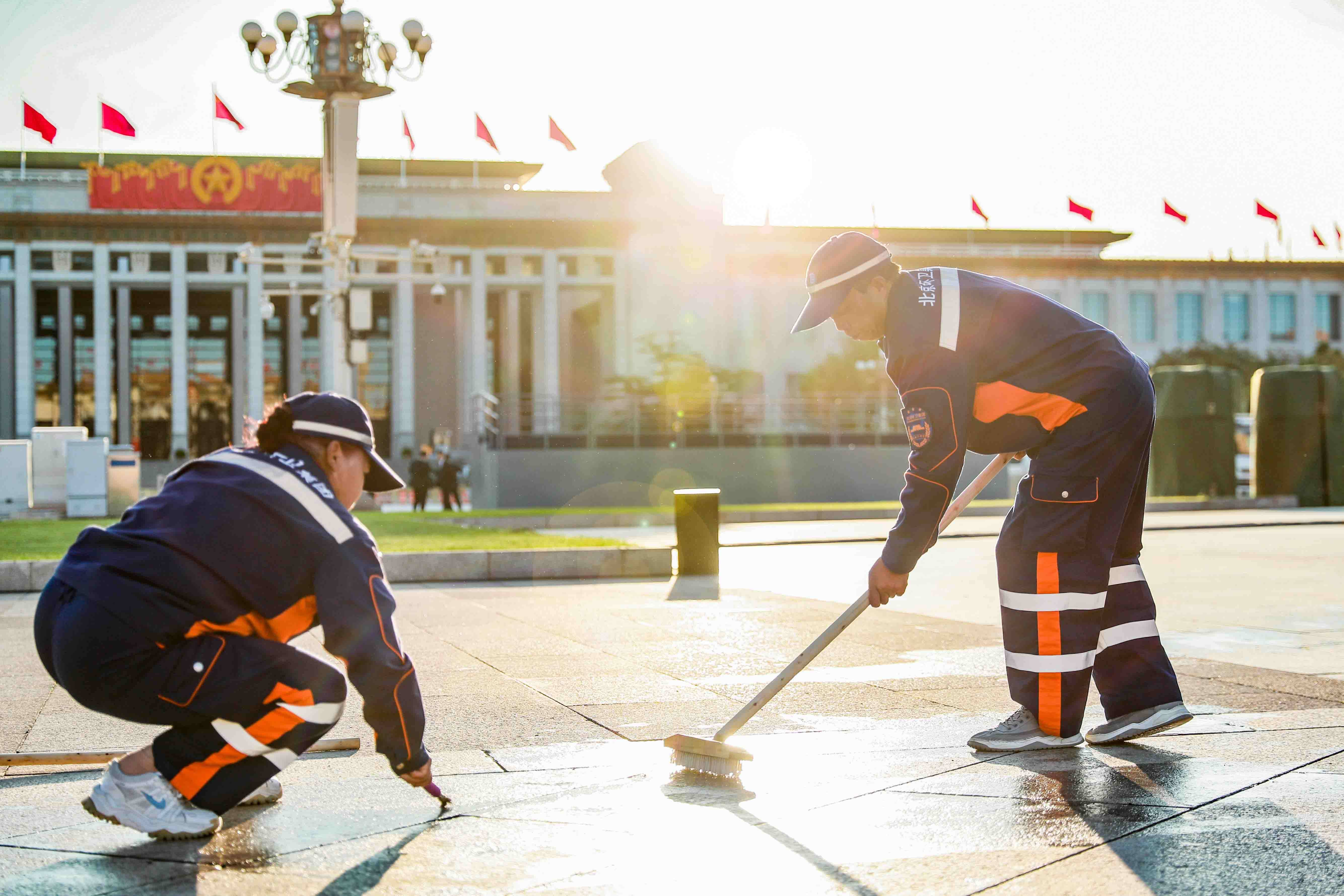为全力做好服务保障工作,9月15日至22日,集团所属北京机扫公司在天安门广场区域开展“大扫除”,先后对广场、安检口、地下通道、人行步道等区域进行深度清洗,对护栏、电话亭等设施进行仔细擦拭。“白天游客比较多,我们就利用夜间进行全面清洗,从晚上10点干到凌晨1点。”集团所属北京机扫公司天安门环境服务中心党支部书记郑红强说。