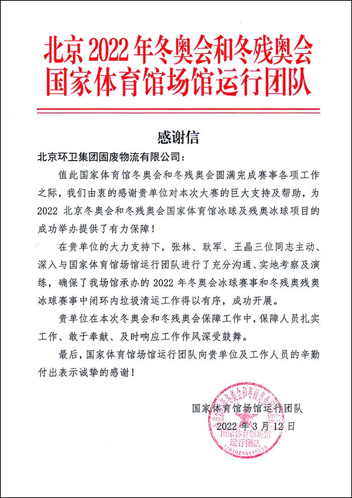 近日,延庆区委区政府、北京冬奥村(冬残奥村)运行团队、国家体育馆场馆运行团队、国家速滑馆场馆运行团队、国家游泳中心场馆运行团队、国家奥林匹克体育中心、北京冬奥会兴奋剂检测中心运行团队、北京北控京奥建设有限公司、张家口物流安检场等单位纷纷发来感谢信,感谢集团及所属单位为冬奥会和冬残奥会的顺利举办所作出的突出贡献!
