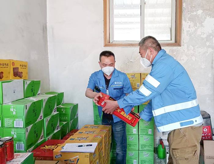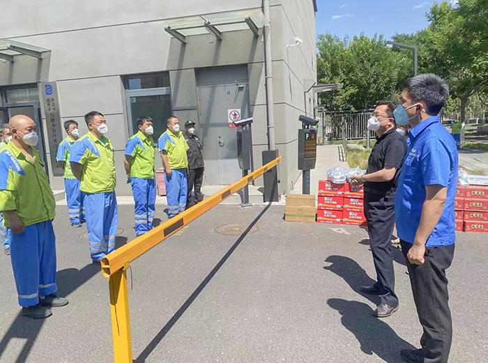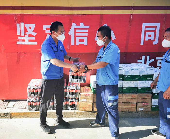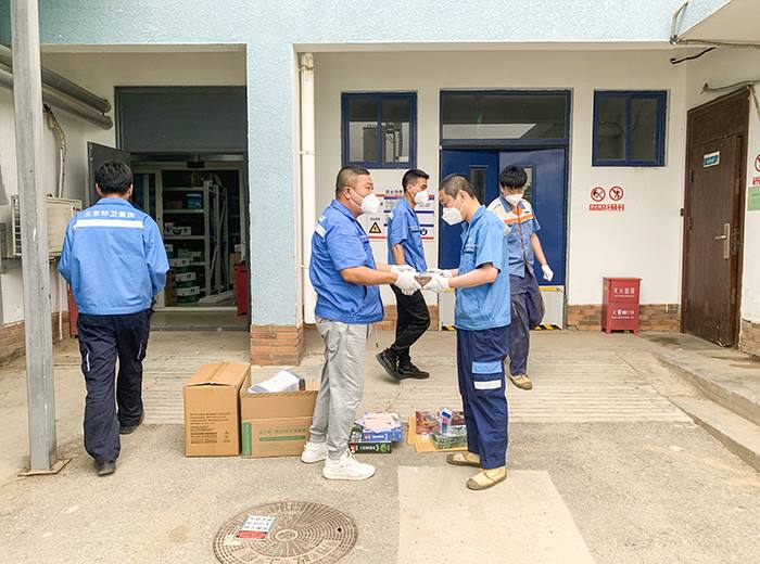 固废物流公司工作人员将慰问品送到抗疫一线作业人员手中